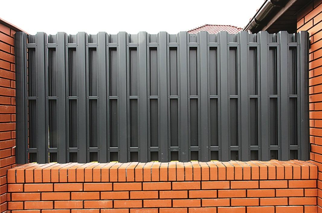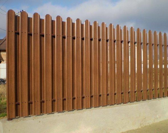 Металлический штакетник изготовлен из оцинкованной стали, покрытой полимерами. Его толщина 0,5 мм, наиболее популярная длина 1,8 м, но на деле она зависит от ваших пожеланий.
